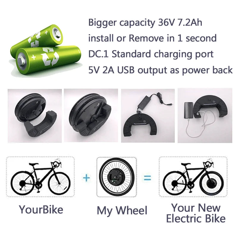 【Packaging List】Includes whole front E-bike Front wheel (including tire), lithium battery, charger, installation accessories, manual